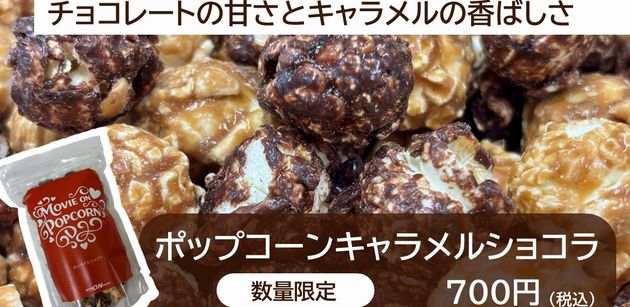 新商品「キャラメルショコラポップコーン」発売中です!チョコレートの甘さとキャラメルの香ばしさ、濃厚な味わいのリッチなポップコーンです!