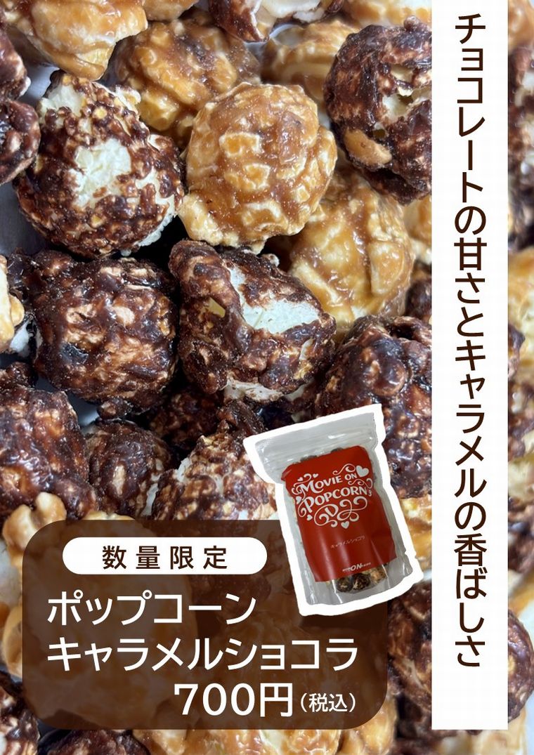 新商品「キャラメルショコラポップコーン」発売中です!チョコレートの甘さとキャラメルの香ばしさ、濃厚な味わいのリッチなポップコーンです!