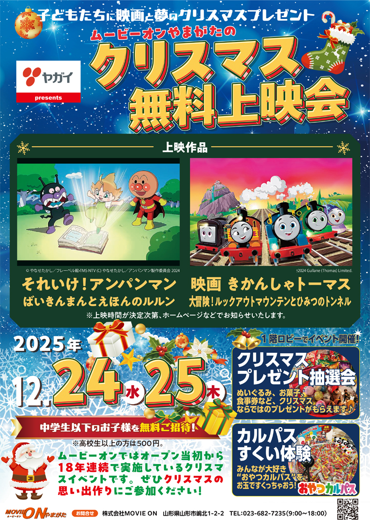 ムービーオンクリスマス無料上映会 12/24(火)・25(水)「それいけ!アンパンマン」と「きかんしゃトーマス」にお子様を無料ご招待!
